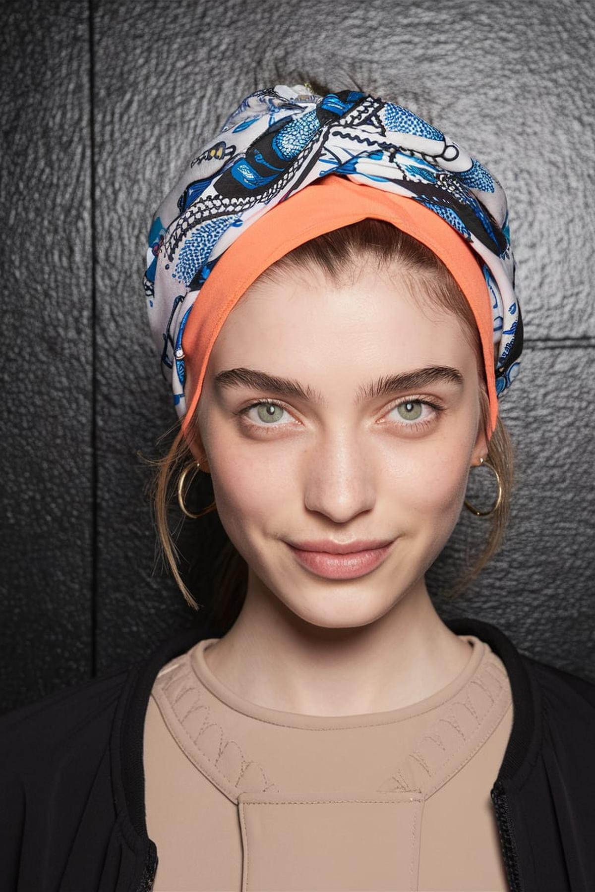 Twist the ends together once and then wrap them around the back again. Finally, tie the ends securely at the back of your head.